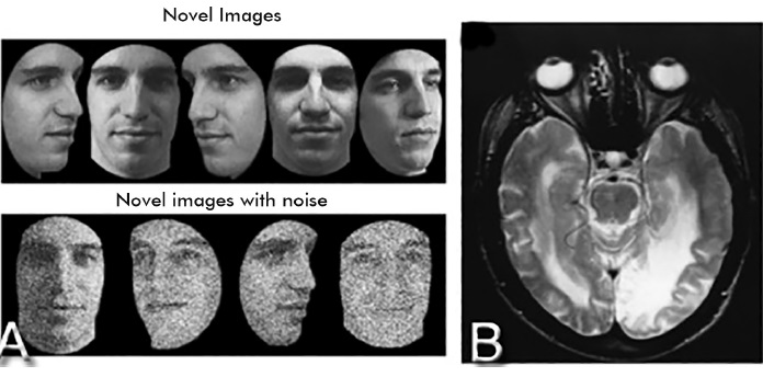 Figura 5 A. Cambridge Face Memory Test.34 B. Corte axial de resonancia cerebral simple ponderada en T2 en paciente con prosopagnosia por infartos de la ACP, principalmente en áreas de los giros fusiforme y lingual.12