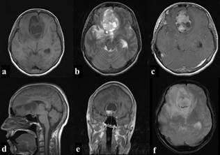 Figure 1 Brain MRI: Axial (a) and sagittal (d) T1 weighted slices presenting a frontal fossa neoplasm of heterogenous intensity, including solid areas and a significant number of cystic degenerative formations. A subfalcine herniation, associated with the volume effect can also be detected. Axial (b) T2 weighted slice confirming the aforementioned and highlighting the presence of significant perilesional edema. Axial (c) and coronal (e) T1 weighted, post-gadolinium images showing heterogeneous enhancement. A slight circumferential blooming is also registered in axial (f) T2 weighted gradient echo.