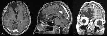 A Computerized-Tomography (CT) scan was performed revealing the presence of an anterior fossa tumefaction, without any accompanying malformations. Magnetic-ResonanceImaging (MRI) confirmed the presence of a heterogeneous contrast-enhancing neoplasm consisted of an admixture of solid and cystic formations (Figure 1).