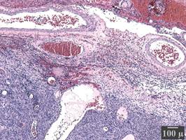Figure 3 Histopathological investigation: Hematoxylin and eosin stain (x40) of sections acquired from the peripheral part of the neoplasm. Tumor cell infiltration of the dura matter (an endosteal layer of dense fibrous connective tissue, containing a significant number of blood vessels).
