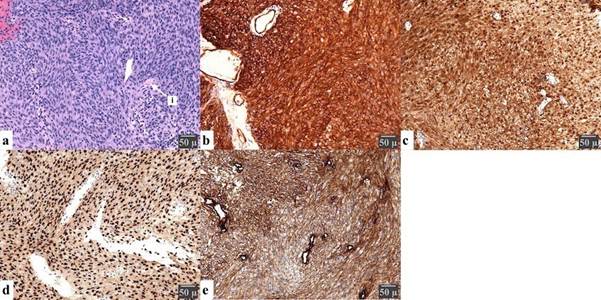 Figure 4 Histopathological investigation: Sections present a cellular spindled to slightly epithelioid cellular proliferation with no significant atypia, low mitotic activity, and foci of necrosis on Hematoxylin and eosin staining (a), arranged in Antoni A (hypercellular) and Antoni B (hypocellular) areas with interspersed Varocay bodies (i). Immunochemical stains show that the neoplasm is diffusely positive for vimentin, S-100(c), SOX10(d), Collagen type IV(e) and CD34(b) while being negative for EMA, desmin, ALK, STAT6, and GFAP with low (<5%) positivity for Ki67 and less than 3/10 HPF nuclear movements. A scale is provided to present the magnification.