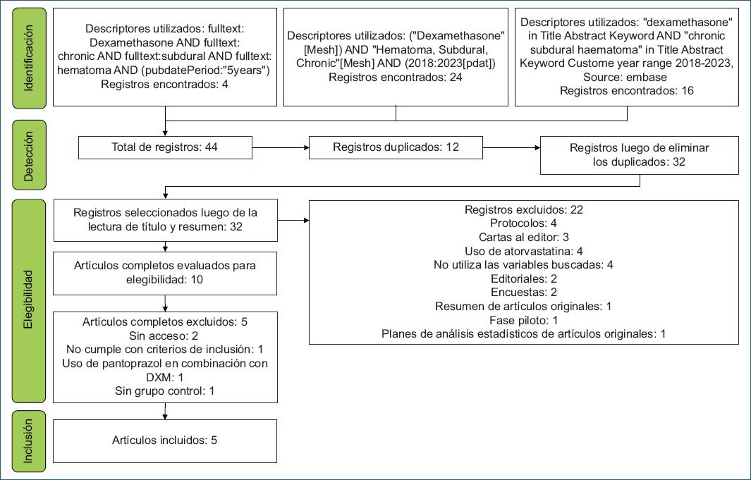 Se realizó una revisión sistemática de acuerdo con las pautas PRISMA 2020 y se llevaron a cabo búsquedas avanzadas en idiomas inglés y español en las bases de datos NEJM, PubMed y Embase a través de Cochrane Library, utilizando los descriptores y operadores booleanos "Dexamethasone" AND "Hematoma, Subdural, Chronic", y con el rango de años 2018-2023.