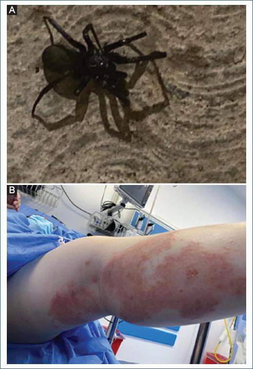 Figura 1 A: araña identificada perteneciente al suborden Mygalomorphae, que incluye arañas coloquialmente conocidas como tarántulas. B: placas eritematosas fusionadas con vesículas con bordes mal definidos, predominantemente en su pierna izquierda.