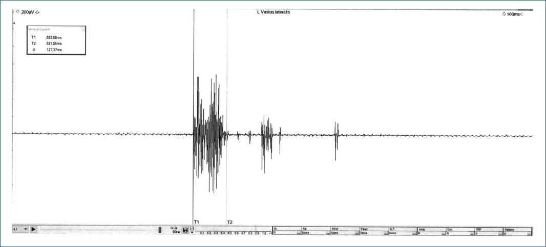 Figura 2 Electromiografía del vasto lateral izquierdo. Actividad normal de inserción. En reposo, se observa actividad muscular irregular y no rítmica, con frecuencia variable que aumenta con el estímulo táctil. Esta actividad comprende múltiples unidades motoras con activación simultánea y dura hasta 211 milisegundos. Las contracciones parciales y máximas no se pueden valorar por la interrupción por movimiento involuntario.