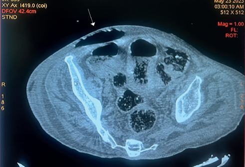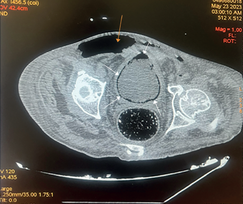 Se observa la misma lesión en la pared abdominal señalada previamente (flecha anaranjada), pero además se identifica la lesión vesical enfisematosa evidenciada por la presencia de gas circundante a la vejiga (ver gas circundante a la vejiga en las flechas blancas).