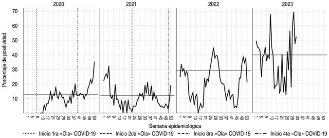 Figura 1: Porcentaje de positividad según la semana epidemiológica, cada columna corresponde a un año diferente. La línea de color gris del eje de las X corresponde a la mediana del porcentaje de positividad anual (2020: 12.82%; 2021: 11.96%; 2022: 29.17%; 2023: 39.93%).
