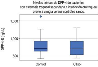 Análisis estadístico: se analizaron diferencias en los niveles de DPP-4 de acuerdo con las diferentes variables quirúrgicas (tiempo quirúrgico, tipo de anastomosis, sangrado, complicaciones, tipo de sutura). Se realizó una descripción de las características de los controles y finalmente se realizó la comparación de las características entre los casos y los controles con la prueba exacta de Fisher para el caso de variables cualitativas y con las pruebas U de Mann-Whitney o Kruskal Wallis (según el número de categorías de la variable) para variables cuantitativas. Asimismo, se realizó la prueba de rango de signos de Wilcoxon para datos pareados, y se evaluó si los cambios en los niveles de DPP-4-S pre y posquirúrgicos fueron estadísticamente significativos. Adicionalmente, se realizó un modelo de regresión logística para evaluar si DPP-4-S podría ser un predictor de estenosis traqueal y se realizó un análisis de sensibilidad y especificidad de la prueba.