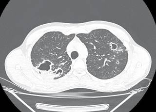 A 24-year-old male, originally from Sonora and residing in the city of Tijuana sought medical attention for his chronic respiratory symptoms. His clinical history was negative for substance abuse, and he did not report any significant illnesses in the past. Symptoms began a year earlier with cough and hemoptysis. He received private medical care, without a definitive diagnosis, and no information is available on the prescribed treatment. A chest CT showed fibrocavitary lesions in both upper pulmonary lobes, with an intracavitary mass suggestive of mycetoma (Figure 1). Given the suspicion of tuberculosis, a series of sputum smears were requested and later reported as negative, as well as an Xpert MTB/RIF (Mycobacterium tuberculosis complex not detected); as routinely done, a culture for mycobacteria was also processed. Sputum smears reported abundant spherules of Coccidioides spp.; later, a positive culture for Coccidioides spp. was reported, in addition to a positive coccidioidomycosis serology with an IgG titer of 1:64. No evidence of extrapulmonary involvement was detected during the clinical evaluation. Treatment with itraconazole 400 mg daily was started; after two months of treatment, the patient was asymptomatic and had gained 2.7 kg.