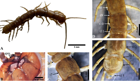 Figura 9 Atethobius scutiger; ♂. A, C, D y E) Vistas dorsales del cuerpo, B) Vista ventral de la placa cefálica. Coxoesternon (ce); diente (d); diente porodonte (dp); forcípula (fc); segundo par de maxilas (spm); terguitos 6-15 (t6-t15).