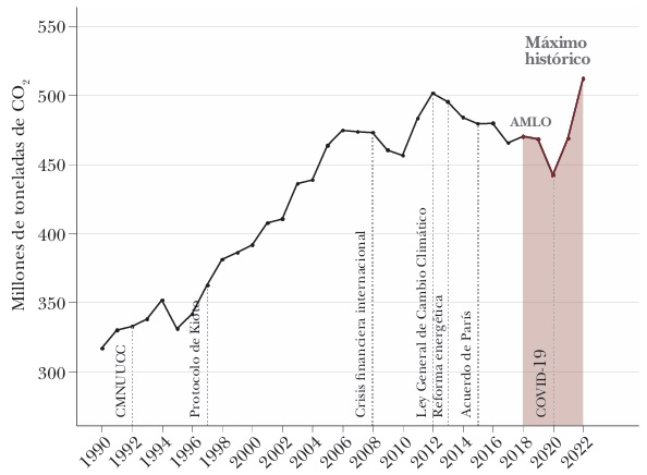 En el sexenio de Andrés Manuel López Obrador (AMLO), la política climática se posicionó entre los temas más controvertidos de su gobierno. Organizaciones ambientales, tanto nacionales como internacionales, criticaron la falta de atención y la erosión de las instituciones e instrumentos de política climática en México. Una de las principales críticas fue la prioridad dada a la extracción y aprovechamiento de los combustibles fósiles, que se contraponía directamente con el cumplimiento de las metas de reducción de emisiones de gases de efecto invernadero (GEI) establecidas en la legislación nacional y el Acuerdo de París. Más allá del debate público, estas políticas resultaron en un incremento significativo de las emisiones nacionales de GEI, que alcanzaron su máximo histórico en este sexenio (véase la gráfica 1).