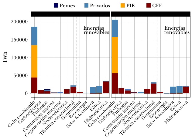 Este enfoque contrastó claramente con la dirección de las reformas y políticas impulsadas por los gobiernos anteriores. Desde la década de 1990, se había buscado incentivar la participación privada en la generación eléctrica para satisfacer la demanda creciente de electricidad en el país, ante las limitaciones financieras de la CFE. Inicialmente, la reforma en materia eléctrica de 199250 permitió la participación privada en la generación mediante distintos esquemas, como el de producción independiente de energía (PIE), atrayendo inversiones en centrales de ciclo combinado.51 Posteriormente, la LAERFTE de 2008 promovió el desarrollo privado de proyectos de generación con fuentes renovables a través del esquema de autoabastecimiento, impulsando particularmente el desarrollo de plantas de energía eólica. Finalmente, la reforma energética de 2013 y la LIE de 2014 abrieron la generación y comercialización de electricidad a la participación privada, introduciendo las subastas eléctricas para la adquisición de potencia, energía eléctrica y CEL, lo que atrajo inversiones significativas en proyectos de energía solar fotovoltaica y eólicos (véase gráfica 2).