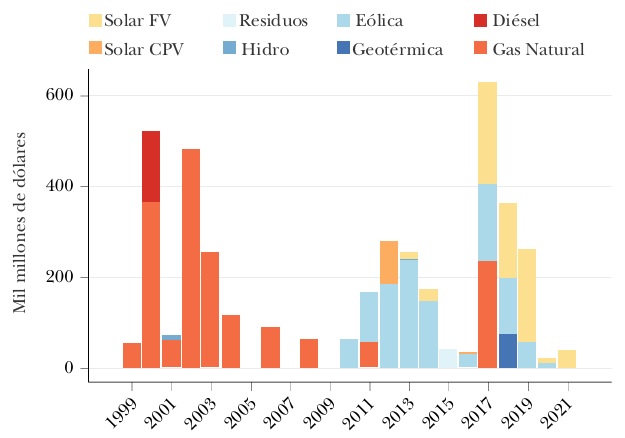 En este sentido, expertos y ambientalistas advirtieron que, si bien la adquisición fortalecía la participación de la CFE, no aumentaría la capacidad neta de generación del país. Además, aunque la decisión respondía en principio al objetivo de fomentar la seguridad y soberanía energética, cuestionaron que resultaba paradójica respecto a estos objetivos: la transacción trasladaría la propiedad de las plantas de ciclo combinado de Iberdrola a la CFE, pero su funcionamiento seguiría dependiendo de las importaciones de gas natural de EE.UU.98 Los críticos argumentaron que, con un presupuesto público limitado, esa inversión podría haberse destinado a financiar el desarrollo de nuevas plantas de energía renovable de la CFE, lo que amortiguaría la caída de la inversión privada en estas tecnologías durante el sexenio (véase la gráfica 5). Esta alternativa no solo habría contribuido a la transición energética y abastecer la creciente demanda de electricidad, sino que también habría permitido aprovechar los abundantes recursos renovables del territorio nacional y bajo jurisdicción del Estado mexicano, abonando de manera más directa a la soberanía energética y la propia modernización de la CFE.