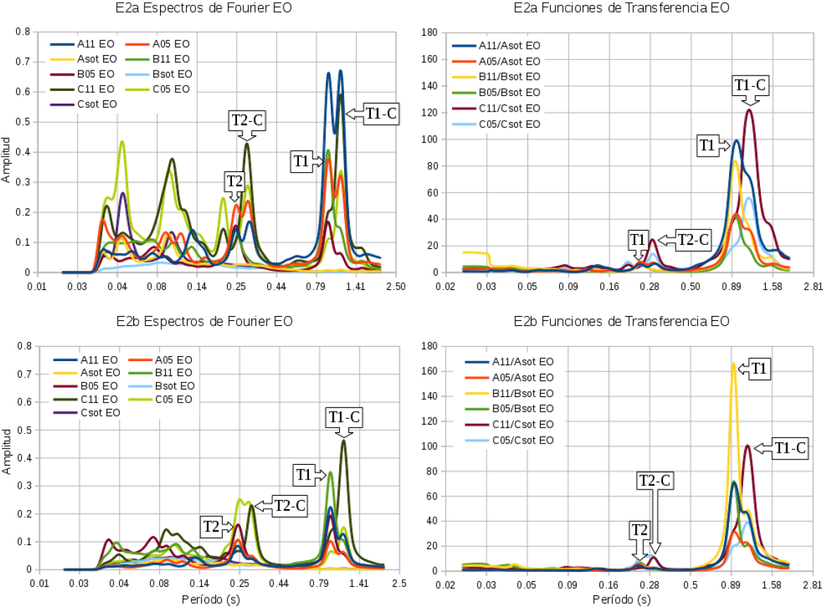 En la Figura 4, para la prueba E1a se aprecian cinco picos entre los 2.8 s y los 0.28 s, tanto para los EF como para las FT, con el tercer (T3) y cuarto (T4) periodo en un “pico doble”. Se puede asegurar que es un pico doble debido a que aparece en las FT, no solo en los EF. Este tipo de picos pueden indicar un posible acoplamiento entre dos modos de vibración, generalmente uno traslacional con uno torsional. Los mismos tienen una amplitud similar en el caso de la prueba realizada a las 3:00 am (E1a) pero con mayor amplitud para el T3 en el caso de la prueba realizada a las 6:00 pm (E1b).