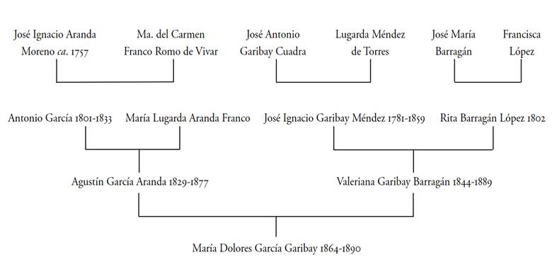La abuela materna María Dolores García Garibay, con apellidos tan poco orientativos, era ya la única oportunidad de localizar raíces en México. Representaba, desde luego, el patrón común en la historia del mestizaje hispanomexicano arriba mencionado: el nexo con México se daba, de manera predominante, en las líneas femeninas, al ser los peninsulares recién llegados, comerciantes que entraban a familias nicho novohispanas (esquema genealógico 6).