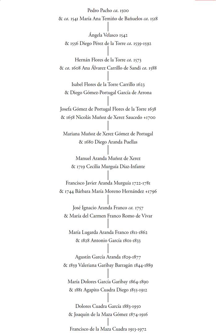 Pero he aquí que ese Pedro Pacho, en estos últimos años, ha trascendido no por la antigüedad en llegar al país y la cantidad enorme de descendientes que tuvo, sino por las características de su pase a Indias, al tratarse de población excluida para hacerlo por ser judeoconverso. Y con el descubrimiento no puede uno dejar de pensar en aquella descripción que hiciese Clementina Díaz y de Ovando y de la nariz “casi hebraica” que alegaba José Rojas Garcidueñas que tenía Francisco de la Maza (esquema genealógico 7).