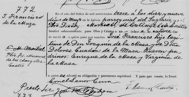 El bautismo fue localizado el día 19 de mayo (según la inscripción, tenía 14 días por lo que no coincidían las fechas proporcionadas en los diccionarios). El sacramento fue administrado en la Parroquia del Sagrario potosino, cuando se le impuso el nombre de José Francisco.30 Los padrinos escogidos fueron Enrique y Virginia de la Maza, por lo que cabría pensar en una elección dentro del grupo familiar paterno (fig. 2).