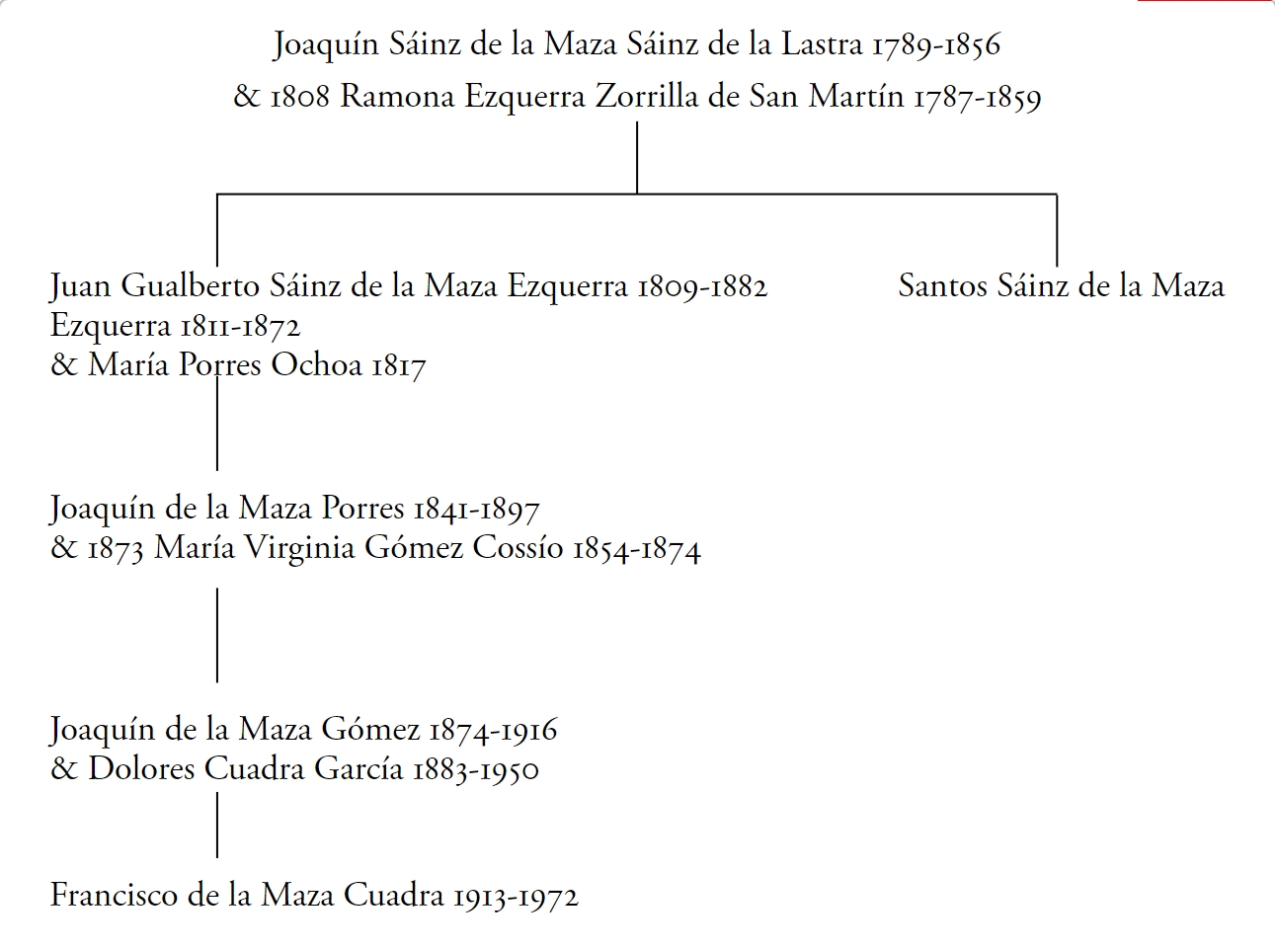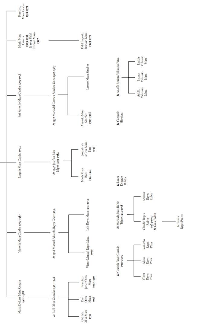 Esquema genealógico 1 Descendencia del matrimonio De la Maza-Cuadra. Joaquín Maza Gómez 1874-1916 & Dolores Cuadra García 1883-1950.