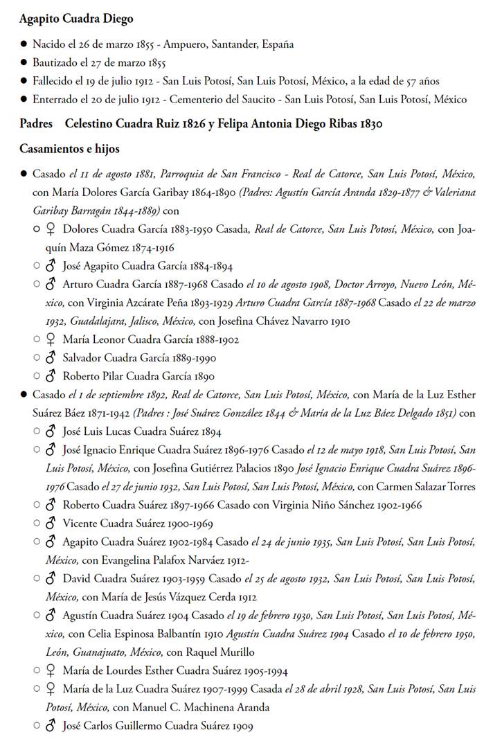 Es curioso notar que, además de los padres de Francisco de la Maza, hubo en el grupo familiar otro enlace con el cual quedaron unidos estos apellidos, al casar Enrique de la Cuadra Gibaja con Marciala Sáinz de la Maza y Gómez de la Puente, esta última prima hermana del abuelo paterno de Paco de la Maza, y ya aludidos. No obstante, se trataba de familias Cuadra de diferente procedencia, si bien todos ellos de la cornisa cantábrica. Recuérdese que a Enrique de la Cuadra le fue concedido el título de marqués de San Marcial por la reina regente el 6 de mayo de 1892,49 y téngase presente que parte de su descendencia llegaría a San Luis Potosí a atender intereses familiares,50 por lo que pudo existir conocimiento entre ella y Paco de la Maza.