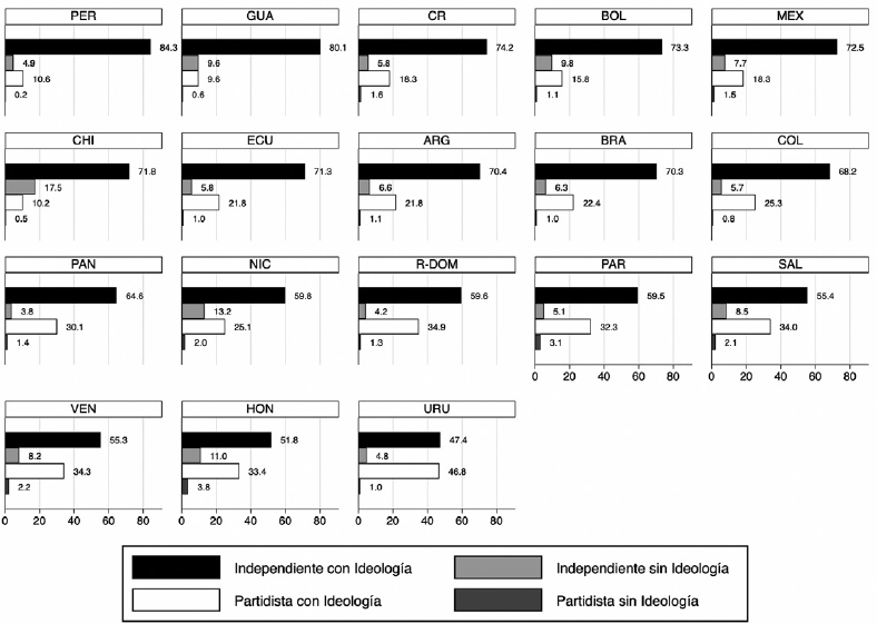 De lo anterior se puede precisar de manera detallada que la distribución de partidistas con ubicación ideológica se extiende desde 46.8 por ciento en Uruguay a 9.6 por ciento en Guatemala. Además de Uruguay, República Dominicana (34.9%), Venezuela (34.3%), El Salvador (34%), Honduras (33.4%), Paraguay (32.3%) y Panamá (30.1%), son los casos con mayor presencia de este tipo de ciudadanos. En el otro extremo, sumado a Guatemala, se encuentran Chile (10.2%), Perú (10.6%), Bolivia (15.8%), México (18.3%) y Costa Rica (18.3%). Como se enfatizó en el caso de los partidistas con ubicación ideológica, su identificación partidaria se ve reforzada por su ubicación ideológica y viceversa.
