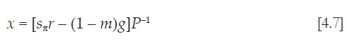 Si se dinamizan las ecuaciones [4.9] y [4.10], y se emplean minúsculas para expresar la tasa de crecimiento de las variables, se obtiene que la tasa de crecimiento de la oferta de exportaciones, xs = g, se reduce a una función positiva de los términos de intercambio ya que g depende de la tasa de beneficio, la cual a su vez lo hace de forma positiva de los precios relativos: xs = ασP. Por su parte, la tasa de crecimiento de la demanda de exportaciones, xd = μp + ξz, depende negativamente de los términos de intercambio y de forma positiva del crecimiento externo. Igualando ambas tasas de crecimiento, y asumiendo que g = g0 + βr, se obtiene la ecuación de cambio en el tiempo de P: