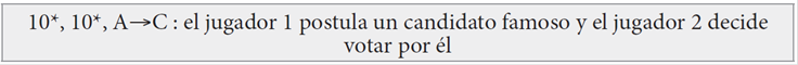 A→C : el jugador 1 postula un candidato famoso y el jugador 2 decide votar por él.