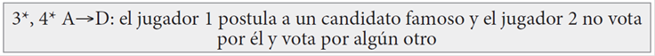A→D: el jugador 1 postula a un candidato famoso y el jugador 2 no vota por él y vota por algún otro.