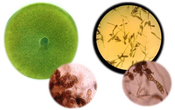 Figura 1 Características morfológicas de la cepa CICY004 (A. chrysanthemi), A). Morfología de la colonia en medio agar extracto de malta, B) conidios de la cepa CICY004.