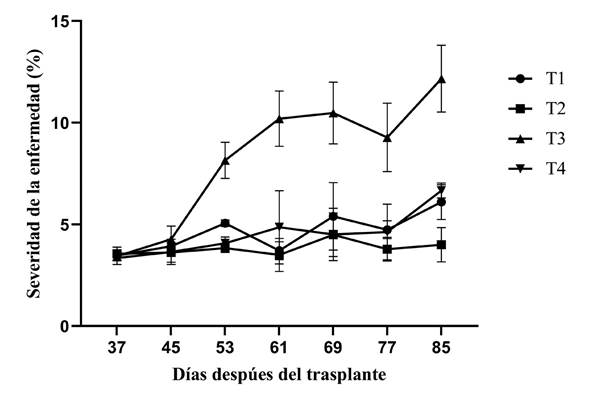Efecto de extractos en campo sobre el control de la enfermedad. Los síntomas de la enfermedad del tizón foliar en el cultivo se presentaron a los 37 días después del trasplante (ddt). En el control negativo (agua) el progreso de la enfermedad fue mayor que en el resto de los tratamientos (Figura 2).