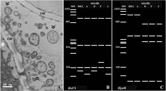 Figura 2 A) Cuerpos pleomórficos de fitoplasmas (») encontrados en el floema de árboles de Bocconia frutescens con síntomas de hoja pequeña y “escobas de bruja”, observados en la provincia de Cartago, Costa Rica. CW = pared celular; B y C) Perfiles de los RFLPs virtuales obtenidos en el iPhyClassifier del fragmento 16Sr F2/R2n del fitoplasma asociado a la hoja pequeña en B. frutescens (BfLL, GenBank Acc. No. PP353584) usando BstUI (C) y HpaII. (D). Fragmentos (pb) del marcador de peso molecular (MW): 1353, 1078, 872, 603, 310, 281, 271, 234, 194, 118, 72.