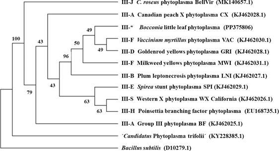 | ` Ca. Phytoplasma pruni` rrnA (JQ044393),Davis et al. (2013) | Fitoplasma asociado a hoja pequeña de Bocconia frutescens (PP353584) |