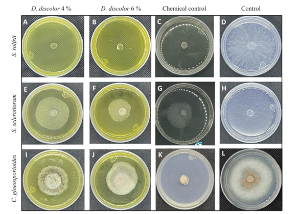 El efecto en fresco de los extractos acuosos de hojas de D. discolor se evaluó un día posterior al procesamiento contra Sclerotium rolfsii, Sclerotinia sclerotiorum y Colletotrichum gloeosporioides, los cuales previamente fueron identificados molecularmente y se comprobó su patogenicidad (Martínez-Álvarez et al., 2021; Martínez-Ereva, 2022; Pérez-Mora et al., 2021). Los experimentos se realizaron en cajas Petri con PDA (Bioxon, Cuautitlán Izcalli, Estado de México, México); los extractos se agregaron al medio de cultivo en el que se ajustaron a las concentraciones de 2, 4 y 6%; v/v. En el centro se colocó un disco de PDA de 5 mm con micelio del hongo con 5 días de crecimiento; se incluyó un tratamiento adicional consistente en el fungicida a 1 ppm (tebuconazol para S. rolfsii y S. sclerotiorum y carbendazim para C. gloeosporioides), como testigo se utilizaron placas de Petri con PDA que contenían únicamente al hongo. Las placas se incubaron a 25 °C, se registró el crecimiento diario de cada uno de los hongos, hasta que el crecimiento del micelio alcanzó el borde de la caja. El porcentaje de inhibición (PI%) se calculó como PI % = (C-T/C) x 100 donde C es el radio del hongo en la placa de control y T es el radio del hongo en presencia del extracto o el fungicida (Paneerselvam et al., 2012). Los experimentos se condujeron en un arreglo completamente al azar con cuatro repeticiones por tratamiento, los experimentos se realizaron dos veces. Se evaluó la vida de anaquel del extracto con la concentración más eficaz observada en las pruebas in vitro (extracto de hoja al 6%). El extracto se conservó a 4 °C, y las evaluaciones de efectividad biológica se realizaron a los seis meses después de su obtención. Estos experimentos se realizaron de la misma manera que en el ensayo in vitro descrito anteriormente.