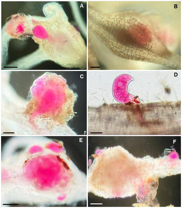 Figure 3 Micrographs of Rotylenchulus reniformis and Meloidogyne enterolobii parasitizing cucumber and tomato roots at 50 days after inoculation (DAI). A) Female of M. enterolobii in cucumber root. B) Female of M. enterolobii causing galls in tomato root. C) Female of R. reniformis affecting cucumber roots. D) Female of R. reniformis in tomato root. E) Cucumber root with a gall caused by M. enterolobii and three mature females of R. reniformis around it. F) Tomato root with a gall from M. enterolobii and necrosis caused by R. reniformis. Scale Bars: A= 300 μm; B, E, F= 500; C, D= 100 μm.