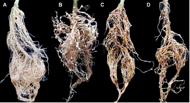 Figure 4 Tomato roots at 50 days after inoculation (DAI). A) Control without inoculation. B) Root with galls caused by M. enterolobii. C) Root with stunting and necrosis caused by R. reniformis. D) Root with galls, necrosis, and stunting symptoms, inoculated with R. reniformis and M. enterolobii simultaneously.