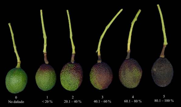 La severidad se evaluó con el apoyo de una escala de clases elaborada por el método arbitrario, bajo el supuesto de que el ojo humano tiene la capacidad de leer tejido enfermo por un porcentaje inferior a 50 % y tejido sano por encima de este valor (Horsfall y Barratt, 1945). Se colectaron frutos con diferentes grados de síntomas de la enfermedad, y también frutos sanos, lo que llevó a crear una escala conformada por seis clases, la cual fue de 0 a 5, donde 0 = fruto sano y 5 = frutos con 100 % de severidad (Figura 1). Con base en esta escala, se evaluó el daño en frutos de aguacate que recibieron los diferentes tratamientos. Los datos obtenidos fueron transformados a porcentaje de severidad