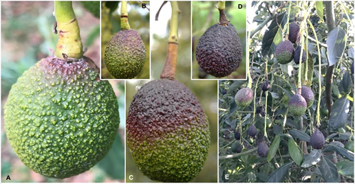 Figura 2 Síntomas típicos del anillamiento de pedúnculo en frutos de aguacate var. “Hass”. A y B) Frutos con anillamiento en el pedúnculo de color café obscuro; C) Pedúnculo corchoso y fruto de color púrpura en el exocarpio; D) Fase final del anillamiento, fruto de aguacate momificado y pedúnculo necrosado; E) Rama con frutos en las diferentes fases del anillamiento.