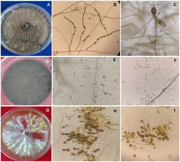 Figura 3 Características culturales y morfométricas de Alternaria tenuissima, C. cladosporioides y E. nigrum. A) Colonia de A. tenuissima de crecimiento plano cultivada en medio PCA. B) Conidios en cadena de 4-13 originados de conidióforos primarios de crecimiento erecto. C) Medición de conidios muriformes con reglilla micrométrica. D) Colonia de C. cladosporioides con micelio flocoso cultivada en medio PDA, parte frontal. E) Medición de conidios unicelulares. F) Conidios solitarios desprendidos del conidióforo. G) Colonia de Epicoccum nigrum de crecimiento plano y desarrollo de micelio algodonoso en medio PDA. H) Formación de clamidosporas multicelulares. I) Micelio septado y clamidosporas globosas de E. nigrum.