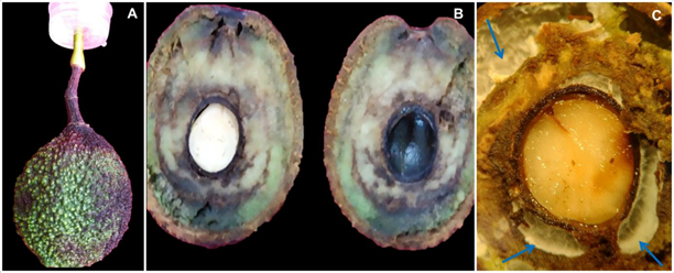 Figura 4 Sintomatología desarrollada en frutos inoculados con Epicoccum nigrum. A) Fruto con daño en pedúnculo y coloración púrpura en exocarpio. B) Corte longitudinal en fruto que muestra lesiones de color café a oscuro en el mesocarpio. C) Crecimiento de micelio en las cavidades del mesocarpio del fruto, observado bajo microscopio estereoscópico.