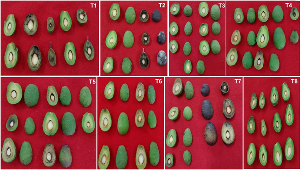 En frutos inoculados de manera individual con los hongos, los síntomas fueron similares; con E. nigrum (T5) los síntomas se mostraron mayormente en el mesocarpio de los frutos, donde se advirtieron manchas cafés y descomposición; en el exocarpio se pudieron ver pequeñas manchas naranjas. La inoculación de A. tenuissima (T6) presentó manchas cafés en pedúnculo y momificación, los frutos exhibieron manchas cafés y descomposición del mesocarpio. En cuanto al tratamiento con C. cladosporioides (T7), en los pedúnculos se apreciaron manchas cafés y momificación, en los frutos se observó una coloración marrón a rojiza en el exocarpio en el punto de unión con el pedúnculo; en el mesocarpio solo se presentaron manchas cafés. Con respecto a los frutos que no recibieron tratamiento con los hongos (Testigo) no manifestaron síntomas, por lo que pedúnculos y frutos permanecieron sanos (Figura 5T1-T8).