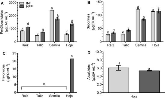 Cuadro 1 Detección de compuestos fitoquímicos de extractos acuosos de hoja de Datura discolor al 6 % obtenidos por infusión (INF) y por procesamiento por alta presión (HPP).