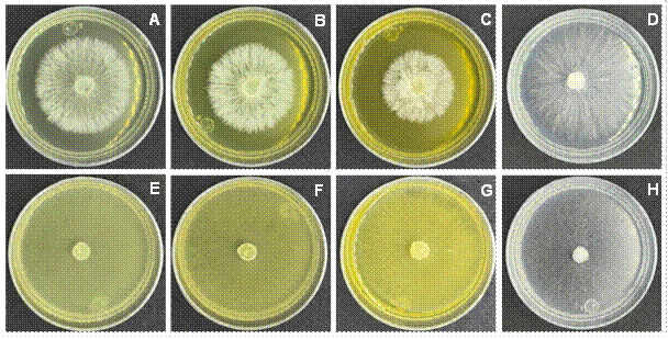 Figura 2 Efecto de extracto acuoso de hoja de Datura discolor obtenido por infusión. Datura discolor (2, 4 y 6 %) y Testigo, respectivamente. A-D Sclerotium rolfsii, E-H Sclerotinia sclerotiorum.