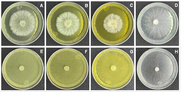 Figure 2 Effect of an aqueous Datura discolor leaf extract obtained by infusion. Datura discolor (2, 4 and 6 %) and Control, respectively. A-D Sclerotium rolfsii, E-H Sclerotinia sclerotiorum.