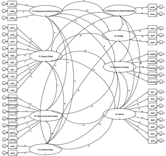 Empirical factors do not correspond to those hypothesized. The EFA analysis showed that the eight factors proposed in GR-II do not correspond to those identified empirically. Among the eight factors identified and shown in Table 4, the only one with exact correspondence was that of conditions in the work environment (F1). Other factors, such as Relationships at work (F7) and Workplace violence (F8) were close to being identified with their theoretical component (6 and 1, respectively). It is recommended that the items not loaded in their theoretical dimension be reviewed, both in their wording and the relevance of keeping them in the instrument. This recommendation goes hand in hand with the revision of the structure of the instrument as a whole since the domain with the highest number of items (20) Workload (F2) is related to three of the eight empirical components, so it is recommended to analyze the relevance of some of its items.