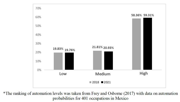 The objective of the research has been to estimate income functions that enable the analysis of inequality among workers with different levels of automation in occupations. Information from the ENOE related to the third quarter of 2018 and 2021 has been used. According to standard theory, the effects of technology on low-skilled workers are not favorable, resulting in wage differentials between skilled and unskilled workers. For this approach, a skilled worker has a completed college degree. In this paper, the educational level has not been considered an indicator of proximity to a technological change variable. Labor occupations and their level of automation have been considered following the methodology of Frey and Osborne (2017). The variable of interest is the monthly earnings of workers, and the key explanatory variable is the probabilities of automation that enable different skill levels to be established. Although technological change is a dynamic process, it is assimilated because it leads to meaningful changes only in the long run.