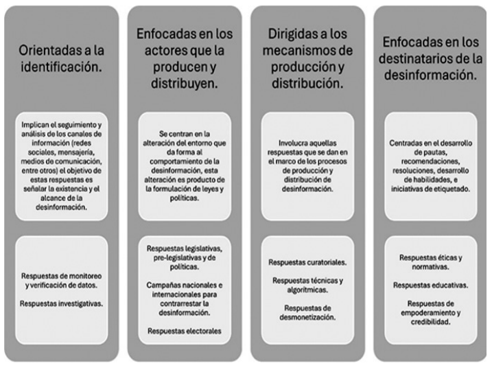 Para el análisis de la información, una vez realizada la recopilación de información, se procedió a categorizar las respuestas a la desinformación empleando la propuesta de Bontcheva y Posetti (2020), la cual identifica once tipos de respuestas a la desinformación agrupadas en cuatro grandes categorías (Figura 1).