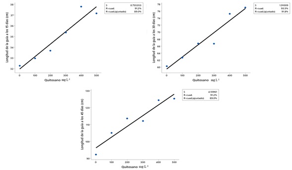 Las tendencias polinomiales para la longitud de la guía a los tres diferentes tiempos se presentan en la Figura 1, en ella se puede apreciar que la tendencia es lineal positiva para todos los tiempos, por lo que la mayor longitud de la guía se presenta a las dosis más altas de quitosano.