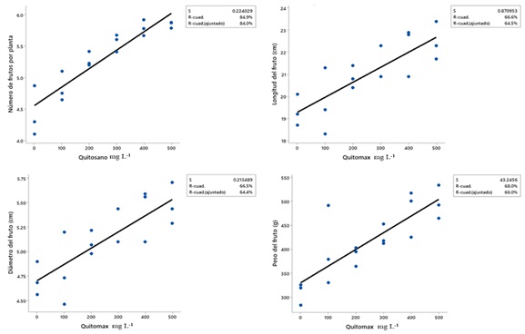 Las tendencias polinomiales para las variables número de frutos, longitud del fruto, diámetro del fruto, y peso del fruto, se presentan en la Figura 2, en ella se puede apreciar que se incrementa la respuesta de las variables, conforme se incrementa la dosis de quitosano, lo anterior concuerda con lo reportado en la literatura científica como respuesta a la aplicación de quitosano.