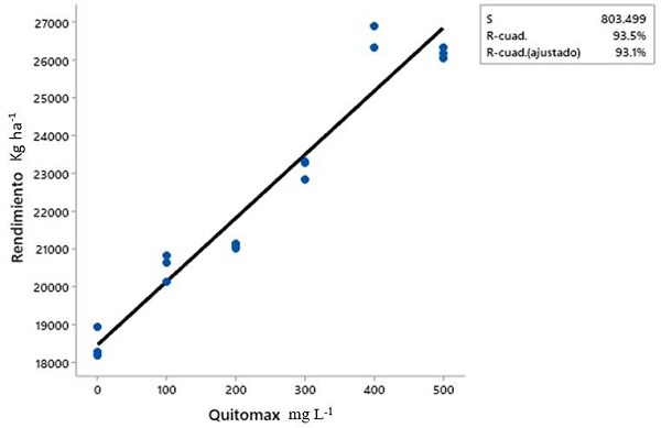 La tendencia polinomial de la variable rendimiento se presenta en la Figura 3, en ella se puede apreciar que al igual que el resto de las variables, el rendimiento se incrementa conforme la dosis de quitosano aumenta, es decir, el rendimiento sigue una respuesta lineal directa en función de la dosis aplicada de quitosano, esta tendencia es igual a la que se reporta en la literatura como respuesta a la aplicación del quitosano y viene a reforzar lo señalado por Du Jardin (2015) quien menciona que los bioestimulantes al aplicarse a las plantas mejoran su eficacia en absorción y similación de nutrientes, tolerancia al estrés y características agronómicas. Su efecto sobre el rendimiento se debe a provocan un incremento fotosintético y permiten la asimilación de carbono y nitrógeno, además de aportar fitohormonas (Salazar-Rodríguez, Martínez y Gallardo, 2021).