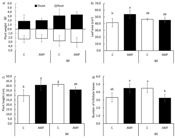 Figure 1: a) Phaseolus vulgaris L. dry weight (foliar and root), b) leaf area, c) plant height, and d) the number of trifoliate leaves in inoculated plants (AMF) and not inoculated controls (C) and irrigated with 50 µM of folic acid (vitamin B9) or not (control, C); 35 days after mycorrhizal and bacterial mixed inoculation. Means ± standard deviation with n=4. Different letters above bars indicate significant differences (Tukey HSD P ≤ 0.05).