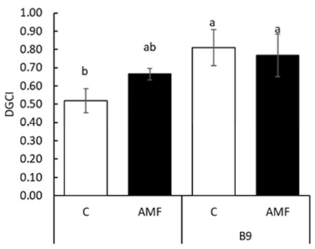 Figure 2: Dark Green Color Index (DGCI) in Phaseolus vulgaris L. inoculated (AMF) and non-inoculated controls (C) and irrigated with 50 µM folic acid (vitamin B9), or not (control, C) 35 days after mycorrhizal and bacterial mixed inoculation. Means ± standard deviation with n=4. Different letters above bars indicate significant differences (Tukey HSD P ≤ 0.05).