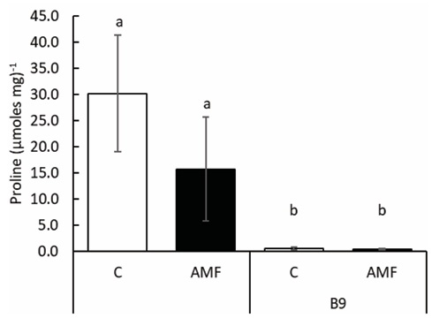 Figure 3: Proline content in leaves of inoculated (AMF) Phaseolus vulgaris L. and non-inoculated controls (C) and irrigated with 50 µM folic acid (vitamin B9) or not (control, C). 35 days after mycorrhizal and bacterial mixed inoculation. Means ± standard deviation with n=4. Different letters above bars indicate significant differences (Tukey H P ≤ 0.05).